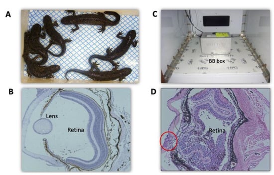 - Mitashov, V.I. Retinal regeneration in amphibians. Int. J. Dev. Biol. 1997, 41, 893–905. [Google Scholar]