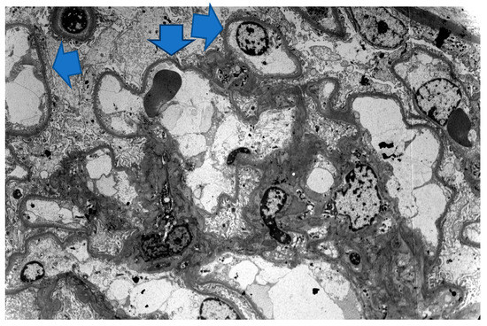 Electron microscopy: diffuse foot processes effacement (blue arrows) with microvilli transformation; no immune-complex deposits were found. Magnification: 2200×.