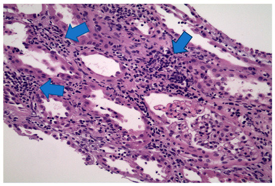 Light microscopy: acute tubular injury, in association with tubulointerstitial nephritis, as manifested by the aggregations of lymphocytes and monocytes into the interstitium (blue arrows), while glomeruli showed no abnormalities. Magnification: H&E 200×.