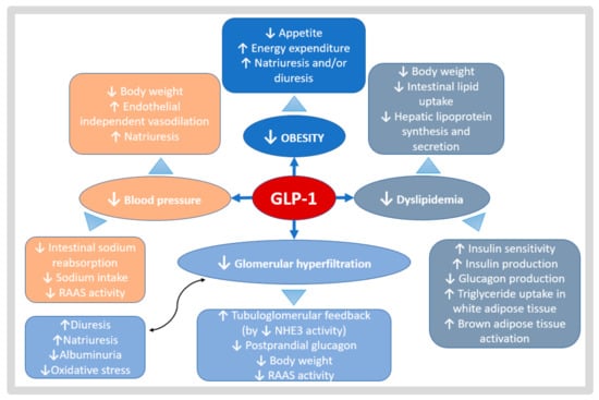 The mechanisms of action of GLP-1RA in the kidney are not completely understood but may involve both neural and nonneural pathways. A gut–renal axis is possible, with regulatory linkages through the gastrointestinal tract, central nervous system, and kidney. The main physiological effect of GLP1-RA on the kidney may be to reduce prandial intraglomerular pressure to reduce the macronutrient (glucose, amino acids, and free fatty acids) loss in the glomerular filtrate. This would allow increased time for macronutrient uptake by other tissues without having to expend energy to transport macronutrients back into the body through the proximal tubule or overwhelming the proximal tubule reuptake system for macronutrients. It may do so by decreasing the sympathetic activity at the glomerulus through the central nervous system or by direct effects on the mesangium and renal interstitium [56,57].