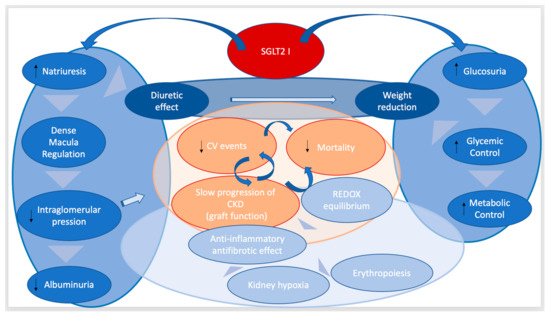 The beneficial effects of these drugs related to renal function consist of decreasing proteinuria, slowing the rate of development of end-stage renal disease, and the need to initiate renal replacement therapy. In addition, it has also been shown that the use of these drugs can reduce cardiovascular events and cardiovascular mortality in patients with CKD [64,70,71], regardless of underlying diabetes [72]. Based on these study results, SGLT2i have emerged even as a new treatment option for CKD [73,74], considering that they are indicated for the slow progression of the disease [22,75]. Renal transplant patients could also benefit from these effects [75], and studies are underway to analyze whether these similar cardio- and renal protective effects may be demonstrated in this population [20,23,29,31].