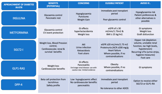 - Anderson, S.; Cotiguala, L.; Tischer, S.; Park, J.M.; McMurry, K. Review of Newer Antidiabetic Agents for Diabetes Management in Kidney Transplant Recipients. Ann. Pharmacother. 2021, 55, 496–508. [Google Scholar] [CrossRef] [PubMed]