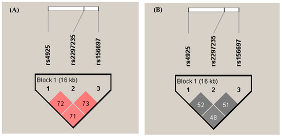 - Barrett, J.C.; Fry, B.; Maller, J.; Daly, M.J. Haploview: Analysis and Visualization of LD and Haplotype Maps. Bioinformatics 2005, 21, 263–265. [Google Scholar] [CrossRef]