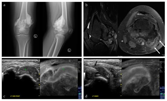 | 18/F | Left posterior knee | US-MRI | Parosteal osteosarcoma, with a chondroblastic component | Neoplastic, malignant |