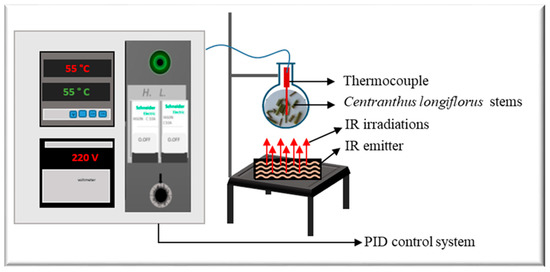 The apparatus Ired-Irrad® [12] was used for the infrared-assisted extraction (Patent 2017/11-11296L) of ground C. longiflorus stems (Figure 1). The prototype consists of a ceramic emitter (Rotfil, Pianezza, Italy), connected to a PID (proportional-integral-derivative) system for voltage and temperature control. Ground C. longiflorus stems were mixed with the solvent (ethanol-water) in a round bottom flask that was positioned at a 1 cm distance from the ceramic IR emitter.