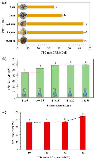 (a) Effect of particle size of ground Centranthus longiflorus stems on the polyphenol’s extraction yield (TPC mg GAE/g DM) using WB extraction technique. (b) Effect of solid to liquid ratio stems on the polyphenols extraction yield (TPC mg GAE/g DM) from C. longiflorus stems using WB extraction technique. (c) Effect of different ultrasound frequencies on polyphenols extraction yield (TPC mg GAE/g DM) of C. longiflorus stems extracts. a, b, and c indicate significant statistical difference (p < 0.05).