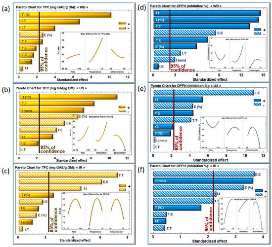 The impact of the extraction parameters was analyzed according to the Pareto charts for TPC (Figure 3a–c) and DPPH (Figure 3d–f) for WB, US, and IR, respectively. Inserts in these figures show the evolution of the TPC (Figure 3a–c) and DPPH (Figure 3d–f) as a function of the three parameters within the studied domains of variation.