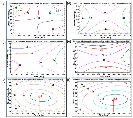 Contours of estimated response surfaces of TPC and DPPH inhibition percentage using WB (a,d), US (b,e) and IR (c,f) extraction techniques of Centranthus longiflorus stems. Every colored line indicates the same value of TPC or DPPH.