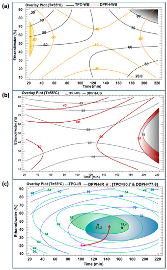 The maximal TPC obtained using IR (81.2 mg GAE/g DM) was reached using 48% ethanol at 55 °C for 127 min. At such mild conditions, this TPC was higher than using WB and US, showing corresponding TPC values of about 63 and 62 mg GAE/g DM, respectively. In addition, the IR extraction technique resulted in the highest DPPH inhibition percentage of 77%, compared to 41% and 74% obtained by WB and US, respectively. The maximums recorded in the case of IR can be considered as optimums standing at the center of the domain of variations of parameters. Every multiple optimum resulted from the combination of two separate optima: the ethanol percentage and extraction time (which both had negative quadratic effects).
