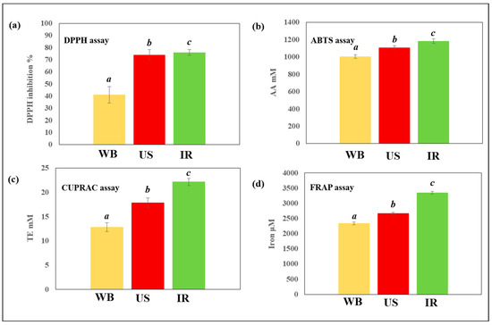 Antiradical and antioxidant activities of Centranthus longiflorus stem extracts obtained using different extraction techniques (WB, US and IR), and assessed by (a) DPPH, (b) ABTS, (c) CUPRAC, and (d) FRAP assays. a, b, and c indicate significant statistical difference between means.
