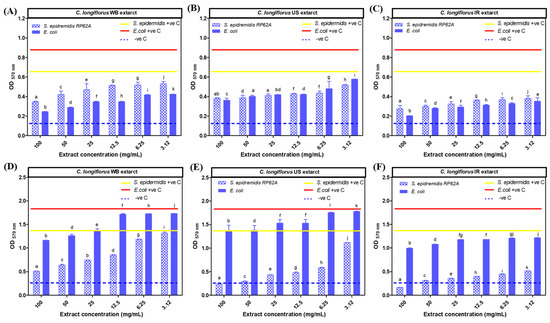 Results of the different extracts showing crystal violet optical density (OD 570 nm) in function of extracts concentrations. (A–C): antibiofilm eradication activity of Centranthus longiflorus stem extracts on Staphylococcus epidermidis RP62A and Escherichia coli strains. (D–F): antibiofilm prevention activity of C. longiflorus stem extracts on S. epidermidis RP62A and E. coli strains. There was a significant difference for the treated wells compared to the untreated ones. −ve C is crystal violet optical density of blank. a–k indicate significant statistical difference (p < 0.001).