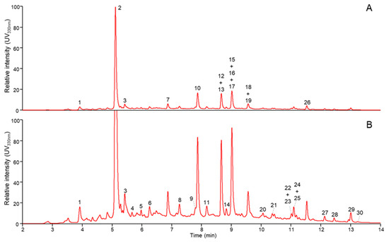 RP-UHPLC-UV elution profiles (330 nm) at full (A) and 5× zoomed intensity (B). Numbers refer to tentatively identified compounds shown in Table 4.