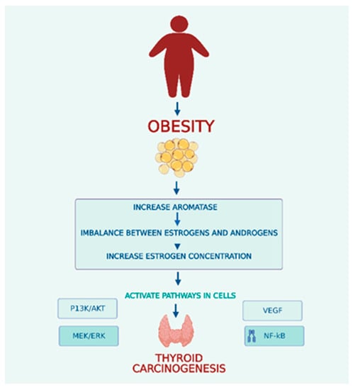 Adipose tissue is responsible for the conversion or synthesis of endogenous sex steroids through aromatase activity. In obese individuals, the overexpression and hyperactivity of aromatase led to an imbalance between estrogens and androgens, resulting in elevated estrogen levels that contributed to the development of thyroid cancer.