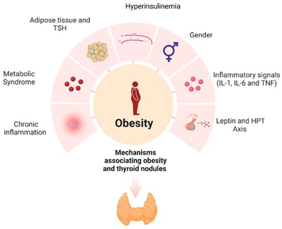 A widely discussed topic in the pathophysiology of thyroid nodules is the role of obesity, a state that leads to increased systemic inflammatory markers. Leptin plays a vital role in forming thyroid nodules and cancer through several mechanisms. Together with chronic inflammation, there is an augmentation in the secretion of tumor necrosis factor (TNF) and the cytokine interleukin 6 (IL-6), which contributed to cancer development, progression and metastasis. In addition, leptin exerts a modulatory action in the growth, proliferation and invasion of thyroid carcinoma cell lines via activating various signal pathways, such as Janus kinase/signal transducer and activator of transcription, mitogen-activated protein kinase (MAPK) and/or phosphoinositide 3-kinase (PI3K)/protein kinase B (Akt). Through several proposed mechanisms, aberrant endogenous estrogen levels have been suggested to play a vital role in the development of both benign and malignant nodules. Metabolic syndrome triggers the development of thyroid nodules by stimulating thyroid proliferation and angiogenesis due to hyperinsulinemia, hyperglycemia and dyslipidemia. Insulin resistance influences the distribution and structure of the thyroid blood vessels. Insulin growth factor 1 (IGF-1) and insulin affect the regulation of the expression of thyroid genes and the proliferation and differentiation of thyroid cells. TSH can promote the differentiation of pre-adipocytes to mature adipocytes but also, in the presence of insulin, TSH possesses mitogenic properties. This review aims to summarize the underlying mechanisms explaining the role of obesity in the pathophysiology of thyroid nodules and discuss potential clinical implications.