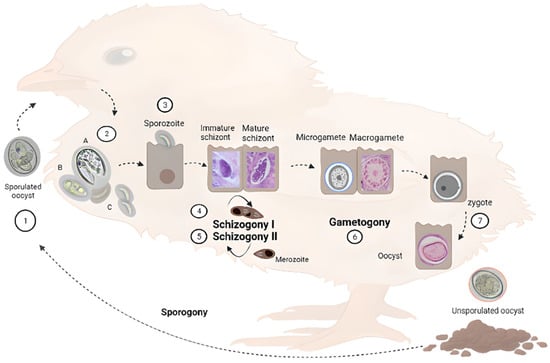 - Burrell, A.; Tomley, F.M.; Vaughan, S.; Marugan-Hernandez, V. Life Cycle Stages, Specific Organelles and Invasion Mechanisms of Eimeria Species. Parasitology 2020, 147, 263–278. [Google Scholar] [CrossRef] [PubMed]