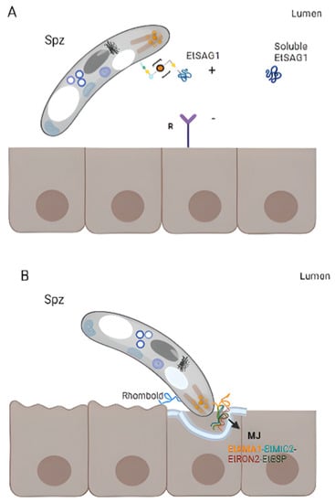 In addition to SAG proteins, there are other proteins secreted from specialised organelles also involved in the host cell recognition and initiation of the invasion process: micronemes and rhoptries. They are present in the apical complex of Apicomplexa (Figure 2A) and all play essential biological functions for the invasion and development of the PV. Proteins secreted from micronemes (MICs) have been studied in different protozoan parasites, including Eimeria [48]. MICs secretion is upregulated through a calcium-mediated release pathway [49,50]. During the invasion, they display adhesive domains and are involved in gliding motility, migration, adhesion to the surface [51,52], and potentially in later egress from host cells after intracellular replication [53]. Some coccidian MICs harbour specific microneme adhesive repeat regions (MAR) domains that are involved in binding sialylated glycans [54]. It has been demonstrated that many of them, but not all, possess a transmembrane domain, among other relevant motifs, providing a dual localisation, i.e., in micronemes and surface membranes after secretion. This is the case for the E. tenella (Et) EtMIC1, EtMIC4 [52,55], and EtMIC8 [56], reasons why they are included in the current review. Apical Membrane Antigens (AMAs) are another well-known family of proteins secreted from micronemes and exported to the surface of the parasite. These were first identified in Plasmodium knowlesi [57] and T. gondii, which have been recognised as important vaccine candidates. Together with proteins from the neck of the rhoptries (RONs), AMA1 is involved in the formation of the moving junction (MJ) complex, a structure created between parasite and host to allow active parasite internalization and PV formation [58]. AMA1 from the apicomplexan parasites Babesia, Toxoplasma, Neospora, and Plasmodium falciparum has proven immunoprotective properties [50,59,60,61].