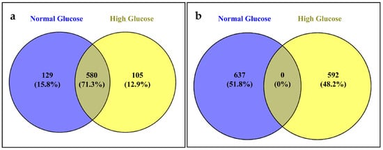 Venn diagram depicting numbers of (a) known and (b) unknown miRNAs identified in control and hyperglycemia-induced HUVECs.