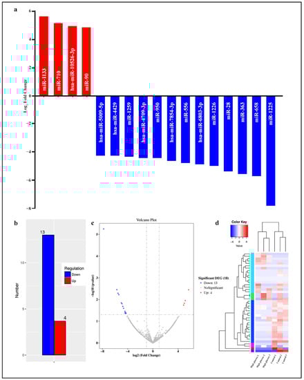 General characterizations of 17 differentially expressed miRNAs in hyperglycemia-induced HUVECs (n = 3) (a,b) Differentially expressed miRNAs displayed in the bar graph of miRNA up- and downregulation across all samples; (c) volcano plot. Red and blue dots represent up- and downregulated miRNAs, respectively, with > twofold decrease and increase in expression in hyperglycemia-induced HUVECs, respectively (p < 0.05). Gray dots indicate miRNAs with no significant alterations in expression levels. (d) Hierarchical clustering analysis of 17 differentially expressed miRNAs in samples using log2 transcript per million values. Blue represents miRNAs with low expression and red denotes high expression. Gradient from blue to red represents the increase in miRNA expression.