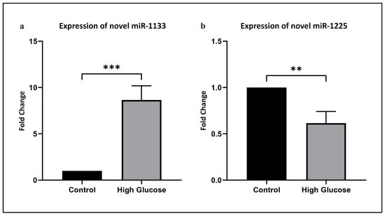 To validate our RNA sequencing data, we selected one of the most significantly upregulated miRNAs (novel miR-1133) and one of the most significantly downregulated miRNAs (novel miR-1125). These miRNAs were further quantified with stem-loop qPCR. The results confirmed that novel miR-1133 was significantly upregulated by 8.7-fold in HUVECs exposed to hyperglycemia compared to the control HUVECs (p < 0.001). Meanwhile, novel miR-1225 was significantly downregulated by 1.62-fold in HUVECs following exposure to hyperglycemia (p < 0.01) (Figure 3).