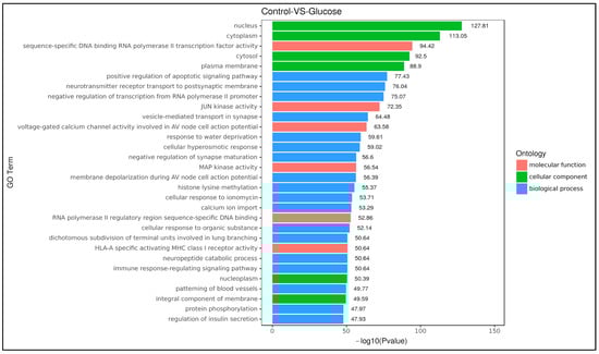 GO functional classification of all differentially expressed miRNAs. GO distributions of the 17 differentially expressed miRNAs in the control vs. hyperglycemia groups were classified into three categories: cellular components (6 subcategories), molecular functions (6 subcategories), and biological processes (18 subcategories).