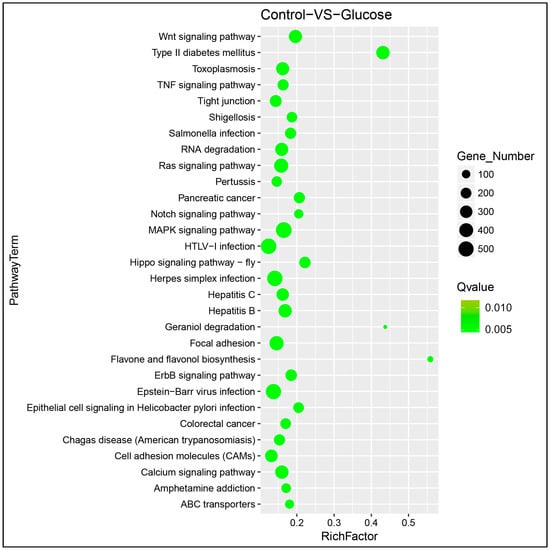 Scatter plot of differentially expressed gene’s KEGG enrichment. The differentially expressed genes were mainly enriched in flavone and flavonol biosynthesis, and Type 2 diabetes mellitus KEGG pathways. The size of the dot is positively correlated with the number of differential microRNA target genes in the pathway. Color code is to indicate different q-value ranges. The larger the rich factor is, the greater the degree of enrichment. The smaller the q-value is, the more significant the enrichment.