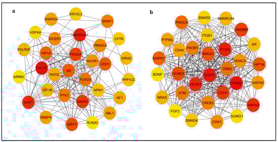 Top 30 hub genes in protein–protein interaction network of the predicted target genes of (a) upregulated and (b) downregulated miRNAs. Red to yellow CytoHubba nodes represent the highest- to lowest-ranked nodes based on the degree ranking method. ABL1, Abelson murine leukemia viral oncogene homolog 1; AGO2, Argonaut RISC catalytic component 2; AR, androgen receptor; ARRB1, arrestin beta 1; ATM, ataxia telangiectasia mutated; BDNF, brain derived neurotrophic factor; BRCA1, breast cancer gene 1; CCND1, cyclin D1; CD44, CD44 molecule; CDH1, epithelial cadherin; CDK1, cyclin dependent kinase 1; CFTR, cystic fibrosis transmembrane conductance regulator; CREB1, CAMP responsive element binding protein 1; CREBBP, cyclic adenosine monophosphate response element binding protein binding protein; CTNNB1, catenin beta 1; DICER1, dicer 1 ribonuclease III; EGFR, epidermal growth factor receptor; ESR1, estrogen receptor 1; FGF2, fibroblast growth factor 2; FOXO3, forkhead box O3; GRB2, growth factor receptor bound protein 2; GRIA2, glutamate ionotropic receptor AMPA type subunit 2; HDAC2, histone deacetylase 2; HIF1A, hypoxia inducible factor 1 subunit alpha; HSPA4, heat shock protein family A member 4; HSPA5, heat shock protein family A; HSPA9, heat shock protein family A member 9; HSP90AA1, heat shock protein 90 alpha family class A member 1; IGF1R, insulin like growth factor1 receptor; ITGB1, integrin subunit beta 1; MAPK1, mitogen-activated protein kinase 1; NCOR1, nuclear receptor corepressor 1; NF1, neurofibromin 1; NPM1, nucleophosmin 1; NRAS, neuroblastoma ras viral oncogene homolog; PIK3CA, phosphatidylinositol-4,5-bisphosphate 3-kinase catalytic subunit alpha; PI3KR1, phosphatidylinositol 3-kinase regulatory subunit alpha; POLR2F, RNA polymerase II, I and III subunit F; PPP1CC, protein phosphatase PP1-gamma catalytic subunit; PRKACA, protein kinase CAMP-activated catalytic subunit alpha; PTEN, phosphatase and tensin homolog; PTK2, protein tyrosine kinase 2; PTPRC, protein tyrosine phosphatase receptor type C; RBBP4, retinoblastoma binding protein 4; RUNX2, runt-related transcription factor 2; SIRT1, sirtuin 1; SKIV2L2, Superkiller viralicidic activity 2-like 2; SMAD2, mothers against decapentaplegic homolog 2; SMAD4, mothers against decapentaplegic homolog 4; SMARCA4, actin dependent regulator of chromatin subfamily A, member 4; SRSF1, serine and arginine rich splicing factor 1; SUMO1, small ubiquitin like modifier 1; VEGFA, vascular endothelial growth factor A.