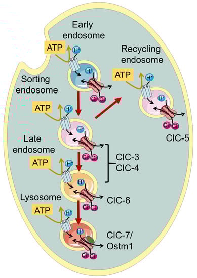 ClC-3 through ClC-7, which are the focus of this review, function as Cl−/H+ exchangers and are localized to intracellular endosomes and/or lysosomes (Figure 1, Table 1). Initially, when the transporter function of the intracellular CLCs was not yet known, it was proposed that they act as charge-shunting chloride channels to assist the luminal acidification of endosomes and lysosomes intracellular organelles [30,31,32,33,34]. Indeed, the maintenance of an acidic pH of the lumen of endo-/lysosomes is required for their proper physiological function. The proton pumping V-ATPase is electrogenic and thus generates an electrical potential difference that would impede acidification if not neutralized by anionic cotransport and/or cationic counter-transport. Somewhat surprisingly and counter-intuitively, model calculations show that a 2 Cl−/H+ exchange activity, contributing to a more inside-negative voltage, allows a more acidic steady-state luminal pH compared to a shunting Cl− channel [35,36].
