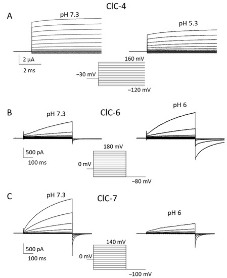Biophysical properties of ClC-4, ClC-6 and ClC-7. Typical voltage-clamp current traces of ClC-4 ((A), expressed in Xenopus oocytes), ClC-6 ((B), expressed in HEK cells), and ClC-7PM ((C), expressed in HEK cells), elicited by the indicated voltage-clamp protocols, measured using the two-electrode voltage clamp method (A) or the whole-cell recording mode of the patch clamp technique (B,C) at neutral (left panels) and acidic (right panels) pH. Extracellular solutions were 100 mM NaCl, 10 mM Hepes or MES, 5 mM MgSO4 (A) or 150 mM NaCl, 10 mM Hepes or MES, 4 mM MgSO4 (B,C). In B and C the pipette solution contained 130 mM NaCl, 10 mM Hepes, 2 mM EGTA, 2 mM MgSO4. ClC-3 is similar to ClC-4.