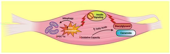 The primary location of energy generation in mammals is the mitochondria, and malfunction of the mitochondria results in the development of a variety of illnesses, including insulin resistance, metabolic syndrome, and malignancy. Reductions in mitochondrial activity in insulin-resistant test subjects used to be the primary goal of the link connecting mitochondria and IR. Aberrant lipid buildup in peripheral organs occurs when lipid oxidation is hampered due to defective mitochondrial functioning [36]. Ceramides and diacylglycerol (DAG) are two examples of lipid metabolites that have been observed to cause stimulation of kinases that affect insulin signaling, particularly at the insulin receptor substrate-1 (IRS1) level [37] (Figure 3). The altered function of the insulin signaling pathways in skeletal muscle diminished GLUT4 exposure, which in turn reduced intracellular glucose absorption. In certain investigations, a decrease in mitochondrial mass or a decline in the ability for oxidative phosphorylation among mitochondria is related to the deterioration of the mitochondrial proficiency to oxidize [38]. However, there is still controversy over whether IR is caused mainly by mitochondrial failure.