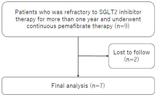 Nine patients fulfilled the inclusion criteria, and subsequently two patients were excluded based on the exclusion criteria (Figure 1). The remaining seven patients were included in the final analysis (Table 1). Median treatment duration with an SGLT2 inhibitor (empagliflozin [n = 6] and dapagliflozin [n = 1]) before starting pemafibrate was 2.3 years. All patients were treated with the addition of pemafibrate 0.1 mg twice daily without dose escalations.