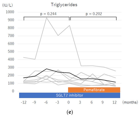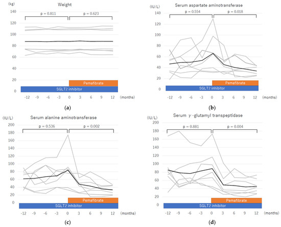 Changes in parameters during a two-year treatment course including one year of sodium glucose cotransporter-2 (SGLT2) inhibitor therapy and one year of pemafibrate add-on therapy. The changes in each parameter shown include mean value of (a) weight, (b) aspartate aminotransferase, (c) alanine aminotransferase, (d) γ-glutamyl transpeptidase, and (e) serum triglycerides. All statistical analyses were performed using Friedman’s test. Dark black line: mean; grey line: each patient.
