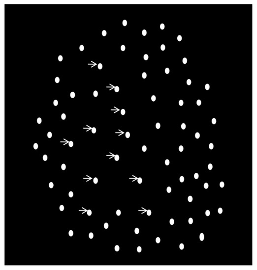 Illustration of the biological motion detection task. The white dots indicated by arrows comprise the walking character to be detected embedded in the noise dots.