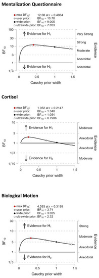Bayesian analysis revealed weak evidence that individuals with low oxytocin levels exhibited lower cortisol levels relative to participants with high oxytocin levels (BF10 = 1.4, error: 0.013%). However, there was moderate evidence for better biological motion detection in participants with high oxytocin levels than in those with low oxytocin levels (BF10 = 3.7, error: 0.006%) and strong evidence for better mentalization (lower MZQ scores) in people with high oxytocin levels than in those with low oxytocin levels (BF10 = 10.8, error: 0.003%) (Figure 2).