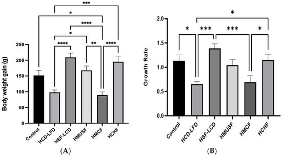 The growth rate for the HSF-LCD group was the highest, while the lowest was observed in the HCD-LFD group. A statistically significant difference in the growth rate (p < 0.05) between the control and HCD-LFD experimental group was observed. Among the experimental groups, statistically insignificant differences were observed between the HCD-LFD, HMUSF, and HMCF groups and between the HSF-LCD, HMUSF, and HCHF groups for growth rate (Figure 2B).