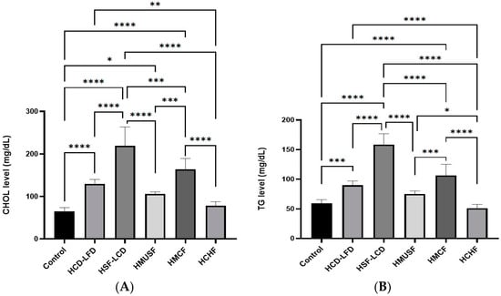Effect of high-carbohydrate, high-fat, and high-fiber diets consumption on (A) cholesterol (CHOL), (B) triglycerides (TG), (C) low-density lipoprotein (LDL) levels, and (D) high-density lipoprotein (HDL), (mg/dL). Data are presented as means ± SD, n = 7/gp. * p-value < 0.05; ** p-value < 0.005; *** p-value < 0.0005; and **** p-value < 0.0001. HCD-LFD—high-carbohydrate, low-fat diet; HSF-LCD—high-saturated-fat, low-carbohydrate diet; HMUSF—high-monounsaturated-fat diet; HMCF—high medium-chain fat diet; HCHF—high-carbohydrate, high-fiber diet.