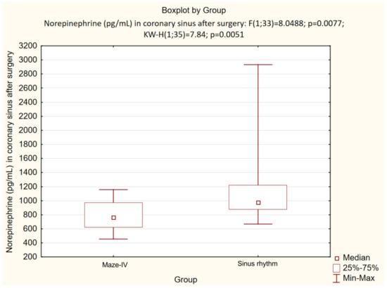 Blood samples were collected intraoperatively from the ascending aorta and coronary sinus prior to cardiopulmonary bypass and 10 min after removal of the clamp from the aorta. The study was performed in the absence of any medications that could affect the catecholamine levels in the samples. In the case of any catecholamine injections, patients were excluded from the study. NE level in blood was assessed both before and after RFA. For the quantitative determination of plasma NE level, we applied Noradrenalin enzyme-linked immunosorbent assay kit (RE59261, IBL, Hamburg, Germany) according to the manufacturer’s protocol. Colorimetric analysis was conducted using Multiskan Sky microplate spectrophotometer (Thermo Fisher Scientific, Waltham, MA, USA). In order to avoid any external influence on the sympathetic tone of the heart during surgery, sympathomimetic drugs were withdrawn before the main phase of the operation, during and after the main stage before the sampling of blood from the ascending aorta and the coronary sinus. All patients underwent 24 h Holter ECG monitoring before the surgery and after removal of sutures before hospital discharge. A re-examination was performed 6 months after the operation.