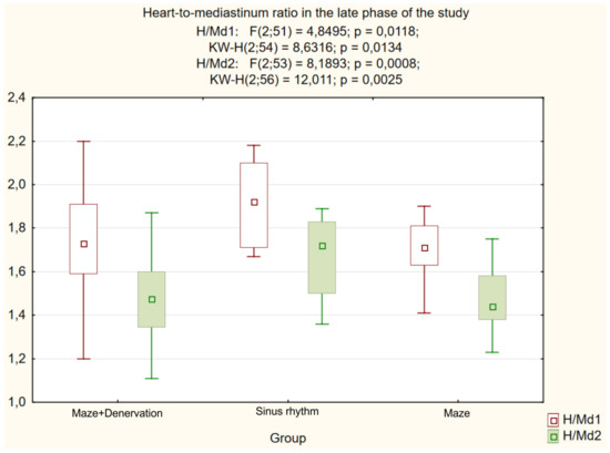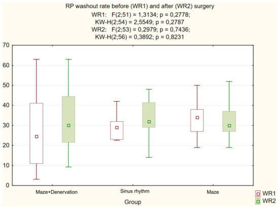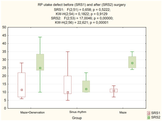 Further analysis demonstrated a significant intergroup difference (p = 0.004) in the postoperative NE level (Figure 2). A decrease in the heart-to-mediastinum ratio directly correlated with the reduction in NE level in the coronary sinus of patients with RFA (group I) compared to the control group with SR, whilst an increased RP uptake defect inversely correlated with the reduced NE level in the coronary sinus. The differences between the subgroups with the “MAZE-IV” procedure in the heart-to-mediastinum ratio (Figure 3), the RP washout rate (Figure 4) and the RF uptake defect (Figure 5) were statistically insignificant.
