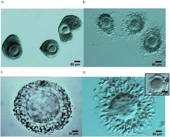 Cumulus enclosed oocytes recovered from ovarian tissue ex vivo (A,B) and following follicular aspiration (C,D). (A) Cumulus-enclosed GV stage oocytes consisted of retrieved ovarian tissue following dissection and preparation for freezing. These COC constituted of healthy tightly compacted cells surrounding the oocyte despite being recovered from an ovary exposed for 2 h at 4 °C. (B) After being in IVM culture for 26 h, the cumulus cells of the matured oocytes expanded and surrounded the oocytes, forming a net of elongated cells partially attached to the dish. (C) A compacted cumulus-enclosed GV stage oocyte retrieved following follicle aspiration, and (D) after 24 h IVM culture enclosing a mature oocyte; an image of the same oocyte after denudation with the polar body visible at 7 o’clock position (right superior corner). All oocytes were cultured in IVM containing patients’ serum that were not subjected to heat-inactivation.