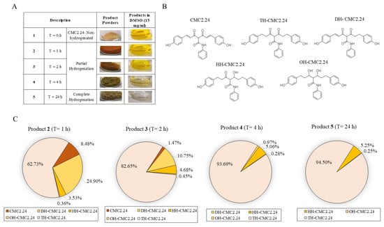 (A) Hydrogenated and partially hydrogenated products of CMC2.24 (compound 1) with the visible gradation in the intense yellow coloration of mixtures in solution form (1.5%); (B) chemical structures of compound 1 and its hydrogenated metabolites (Tetrahydro CMC2.24; TH-CMC2.24, Dihydro CMC2.24; DH-CMC2.24, Hexahydro CMC2.24; HH-CMC2.24, and Octahydro CMC2.24; OH-CMC2.24); (C) Pie charts showing hydrogenated products 2, 3, 4, and 5 with their compositional analysis.