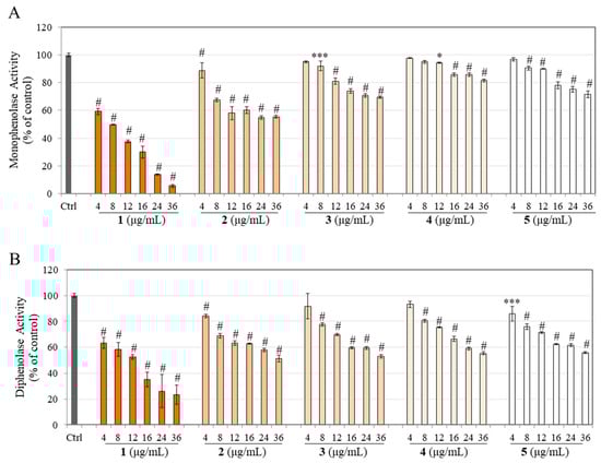 Effect of parent CMC2.24 (1) and its hydrogenated products 2, 3, 4, and 5 on the activity of mushroom tyrosinase catalyzed by (A) L-Tyrosine (monophenolase) substrate or by (B) L-DOPA (diphenolase) substrate. (* p < 0.05, *** p < 0.001, and # p < 0.0001 vs. Ctrl), All data are mean ± SD of triplicate determinations.