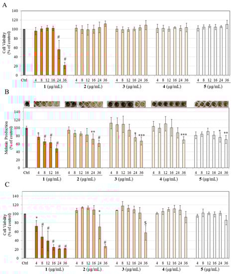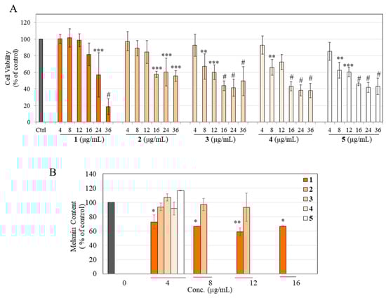 Our results showed that compound 1 displayed significant cytotoxicity to B16F10 cells at higher concentrations of 24 and 36 µg/mL, while product 2 displayed significant cytotoxicity at 16, 24, and 36 µg/mL, respectively (Figure 3A). Products 3, 4, and 5 exhibited greater cytotoxicity and significantly suppressed viability at all concentrations ≥ 8 µg/mL (Figure 3A). The cytotoxicity to B16F10 cells followed the order: 3 = 5 > 4 >> 2 > 1.