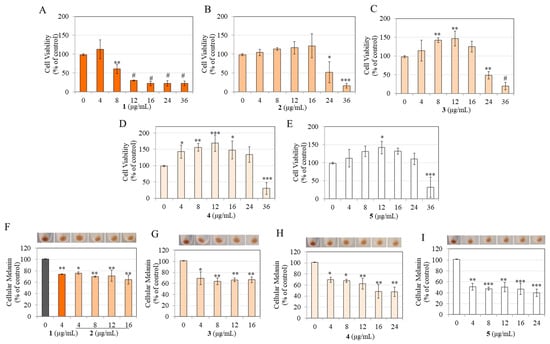 The samples were next assayed in normal human melanocytes obtained from darkly pigmented skin, which is more physiological than human melanoma cells. Our results showed that compound 1 induced the greatest cytotoxicity to HEMn-DP cells with a significant suppression in viability by 37.36%, 68.10%, 75.96%, 76.01%, and 75.74% at 8, 12, 16, 24, and 36 µg/mL concentrations, respectively (Figure 5A). Product 2 significantly suppressed cell viability by 46.68% and 82.16% at 24 and 36 µg/mL concentrations, respectively (Figure 5B), while product 3 showed a similar cytotoxicity profile with significant suppression in viability by 50.15% and 78.53% at 24 and 36 µg/mL concentration, respectively (Figure 5C). Products 4 and 5 were the least cytotoxic, with a significant diminution in viability by 68.77% (product 4) and 66.83% (product 5) only at the highest concentration of 36 µg/mL (Figure 5D,E). Taken together, the profile of cytotoxicity in HEMn-DP cells followed the order: 1 >> 2 = 3 > 4 = 5.