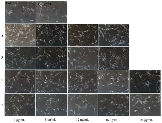Representative phase-contrast images of HEMn-DP cells of the untreated control group and treatment groups for compound 1 at a concentration of 4 µg/mL and products 2, 3, 4, and 5 over 4–24 µg/mL concentration range.