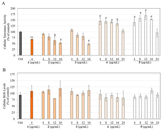 (A) Tyrosinase activity and (B) ROS levels measured in lysates of HEMn-DP cells treated with compound 1 and products 2, 3, 4, and 5 for 6 d; one-way ANOVA with Dunnett’s test. ** p < 0.01, $ p < 0.001, # p < 0.0001 vs. control group. All data are mean ± SD of values combined from at least two independent experiments.