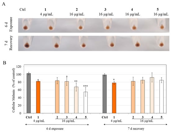 Recovery study of melanogenesis by compound 1 and products 2–5 in HEMn-DP cells. (A) Representative photos of HEMn-DP cell pellets for exposure-recovery and (B) Intracellular melanin level in HEMn-DP cells treated with compound 1 at 4 µg/mL and products 2–5 at 16 µg/mL for a period of 6 d exposure and 7 d recovery. All data are mean ± SD of at least three independent experiments. * p < 0.05, ** p < 0.01, and *** p < 0.001 vs. Ctrl; one-way ANOVA with Dunnett’s test.