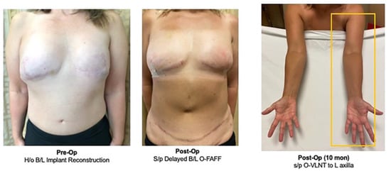 Pre- and postoperative results after delayed bilateral breast reconstruction with bilateral O-FAFF and simultaneous O-VLNT to left axilla. She maintained normal volume in the left arm at 10 months follow-up [32].