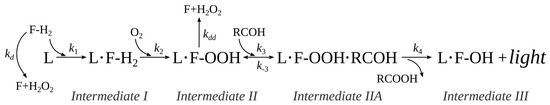 The stages of the reaction catalyzed by bacterial luciferase. L—luciferase, F—flavin mononucleotide, O2—molecular oxygen, RCOH and RCOOH—long-chain aldehyde and corresponding carboxylic acid, H2O2—hydrogen peroxide.
