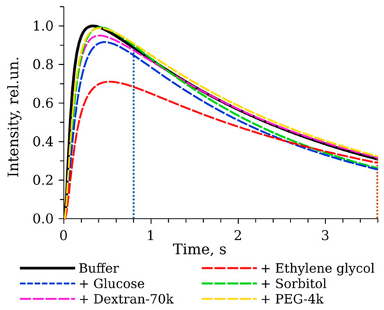Figure 3 shows an example of kinetic curves in solutions with viscosity of about 2 cP in the presence of different cosolvents. In viscous solutions, the kinetics of the first phase of the reaction slightly slows down compared to that in the buffer. Additionally, the decay rates in glucose and sorbitol solutions increase and the peak intensity decreases in the presence of ethylene glycol, while polymeric cosolvents seem to have no effect on the decay rate. Thus, viscosity is not the only factor determining reaction kinetics, and the effects of the medium depend on the cosolvent used.