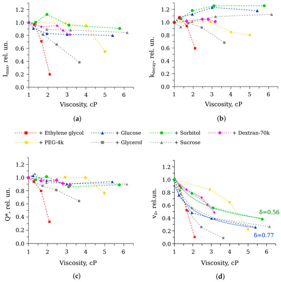 Some patterns could be seen from the viscosity dependencies (Figure 4): (i) the majority of the cosolvents only slightly changed the peak intensity, the decay rate, and, as a consequence, the total quantum yield of the reaction; only ethylene glycol and the previously studied glycerol caused a decrease in these parameters; and (ii) viscous media considerably slowed down the initial velocity of the reaction, but in a different manner; only for some cosolvents, the dependence v0 (η) could be well approximated by the power law function, which was a sign of diffusion limitation. Hence, the influence of the studied cosolvents on the elementary steps of the reaction catalyzed by bacterial luciferase is different, and it is not entirely due to increased viscosity.
