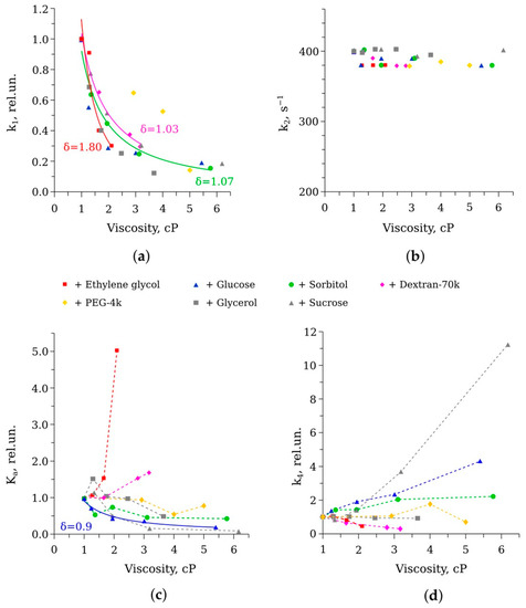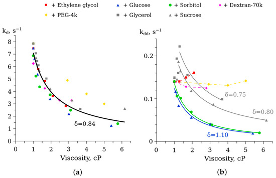 The chemical reaction of oxidation of reduced flavin by molecular oxygen was also found to slow down when viscosity increased, regardless of the type of the cosolvent used (Figure 5a). The deviation of the δ from unity for kd(η) could be attributed to the fact that it is a complex (multi-stage and autocatalytic) process [20], and kd in this instance is not a true rate constant, but an apparent one. A similar decrease in the oxidation rate in viscous media was demonstrated for another important cellular metabolite, NADH [32]. As a consequence, the authors suggested that the accumulation of various viscogenic cosolvents in bacterial cells is a mechanism for the preservation of such a low-molecular-weight metabolite.